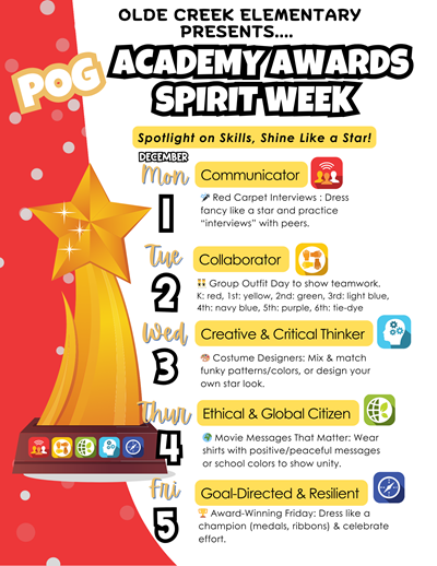 Friday, December 5: It's Award Winning Friday! Dress like a champion by wearing medals, ribbons, etc. as we celebrate effort and being Goal-Directed and Resilient Individuals.