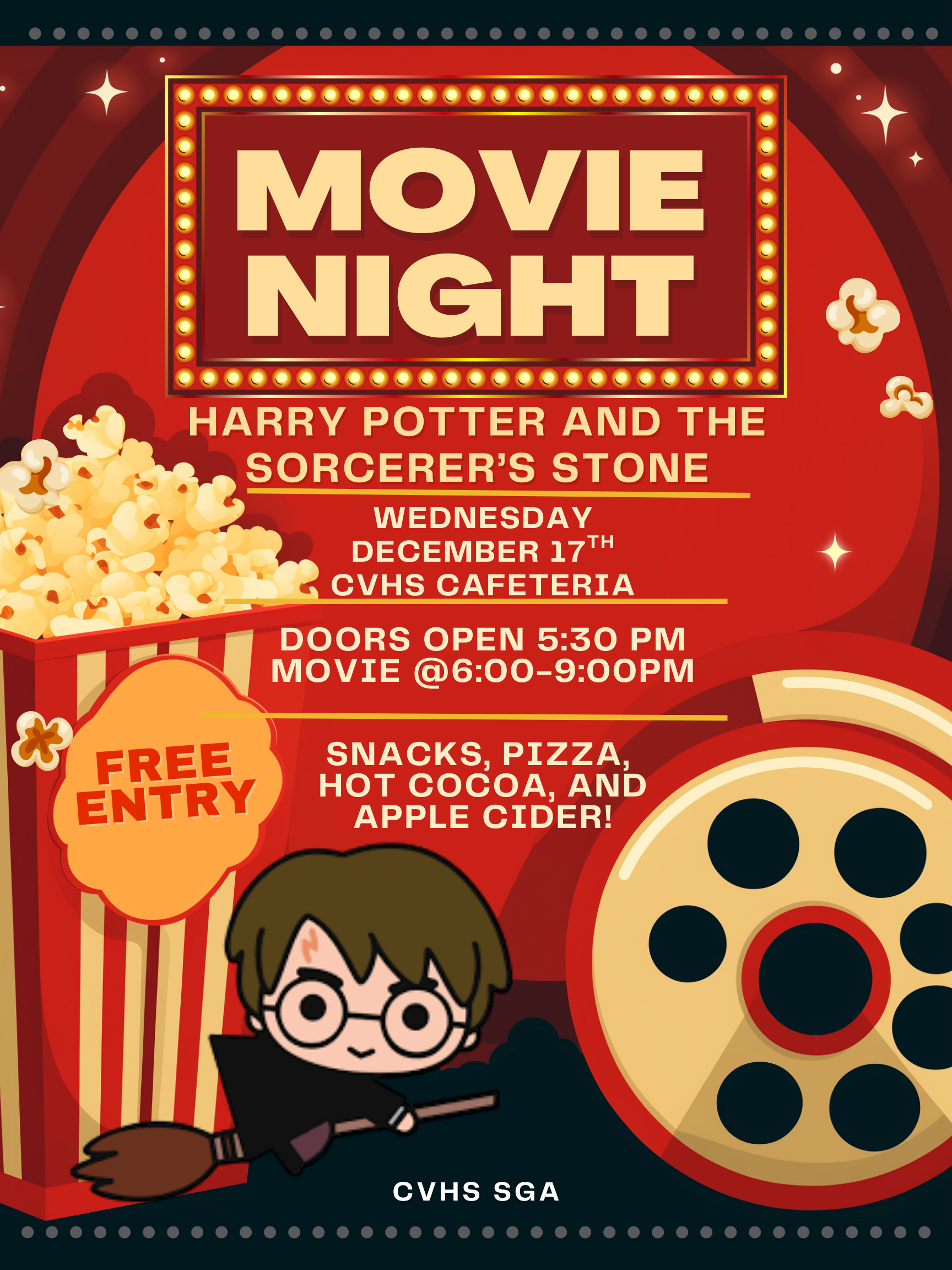 Come to movie night on December 17th. Admission is free, and there will be snacks, pizza, and hot cocoa. We're showing Harry potter and the scorer's stone. The doors to the cafeteria will open at 5:30 PM, and the movie will start at 6. See you there!